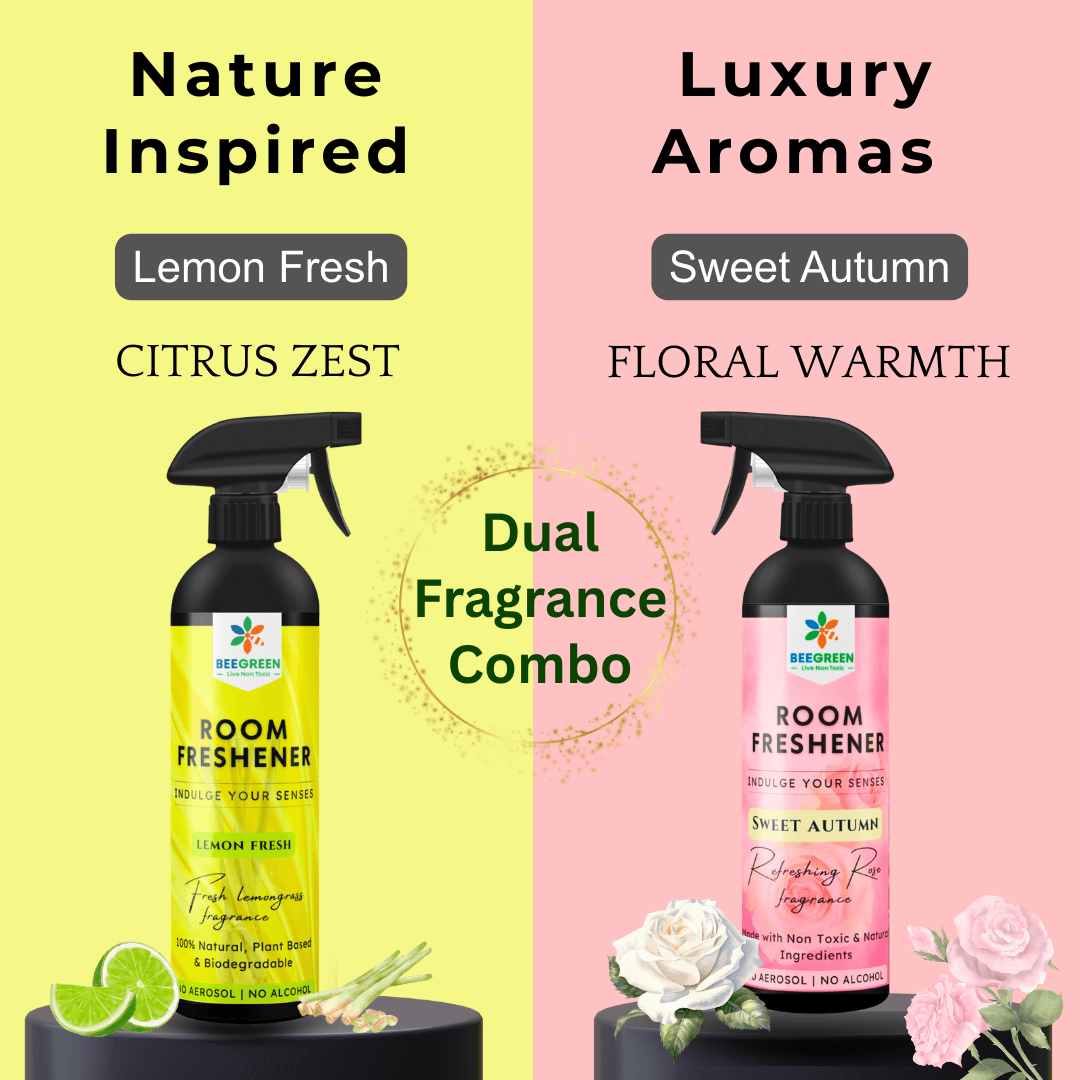 Beegreen Citrus Rose Harmony, a perfect pairing to transform your living spaces with delightful fragrances. This combo features two invigorating scents – the zesty and uplifting Lemon Fresh, and the calming and soothing white roses.