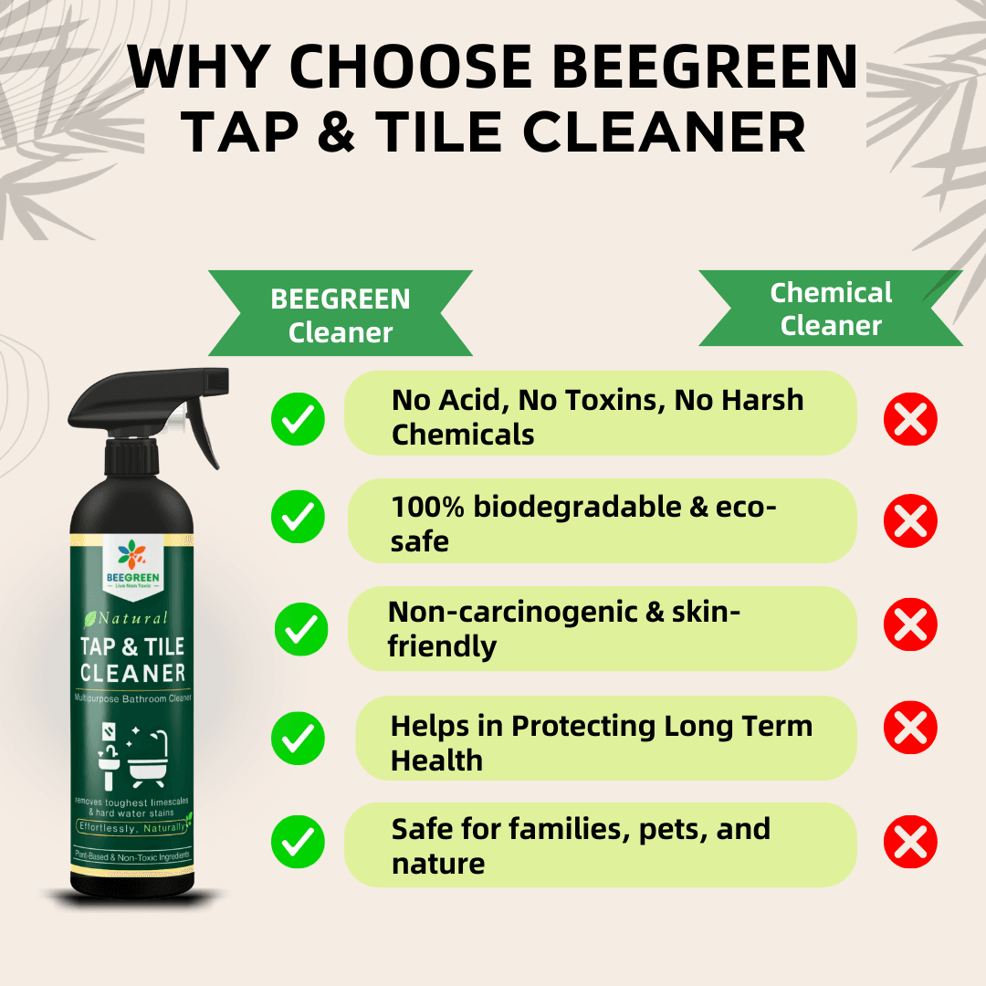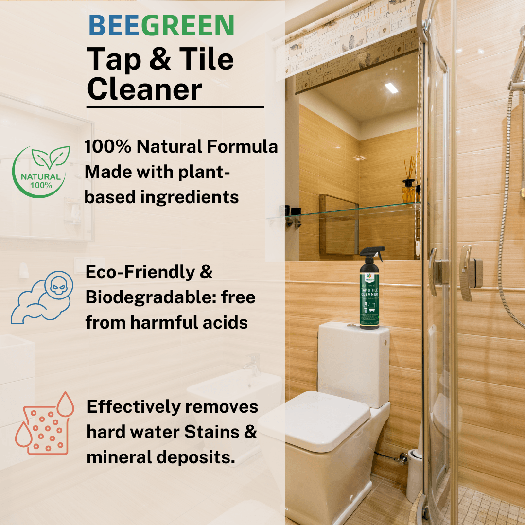 Beegreen Natural Tap and Tile Cleaner is a powerful, plant-based formula designed to clean bathroom surfaces without exposing your family or the environment to toxic chemicals. Whether you’re dealing with soap scum, hard water stains, or mineral buildup, this natural solution is your go-to cleaner for taps, tiles, buckets, sinks, and even shower glass partitions.