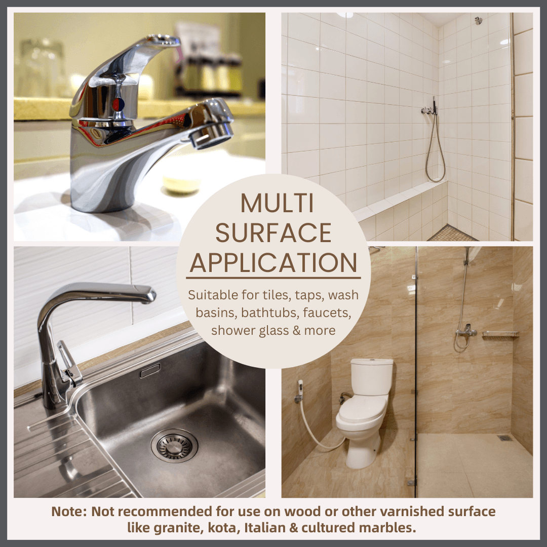 Suitable for chrome fittings, wall & floor tiles, glass partitions, buckets, and more